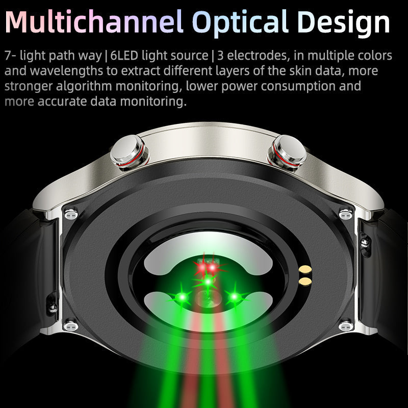 De CardioTrack Smartwatch combineert medische EKG-metingen, zuurstofgehalte en hartslagbewaking in één apparaat. De ingebouwde OSRAM-sensor met meerkanaals-optiek en Fresnel-lens levert nauwkeurige gegevens over hart, bloeddruk en slaap. Dankzij de app-koppeling kunnen gezondheidsrapporten worden gemaakt, trends gevolgd en waarden gedeeld met artsen. Een HD-kleurenscherm, Bluetooth 5.1 en tot 15 dagen batterijduur ronden de uitrusting af.