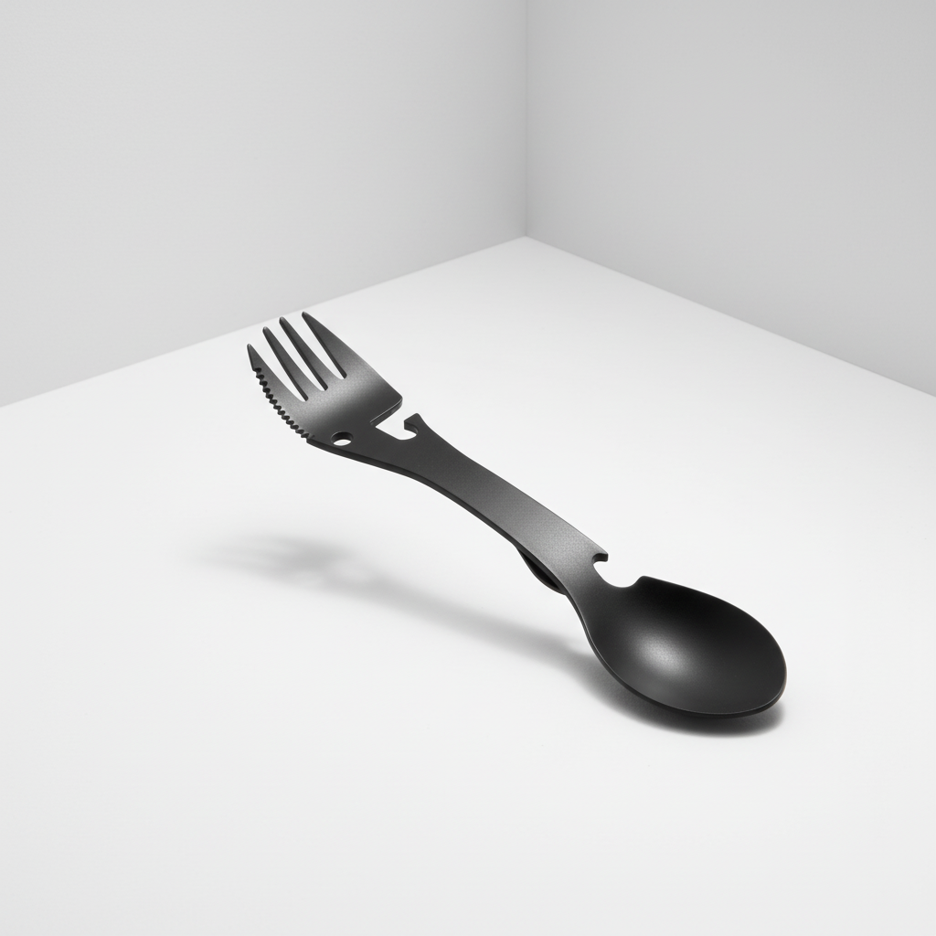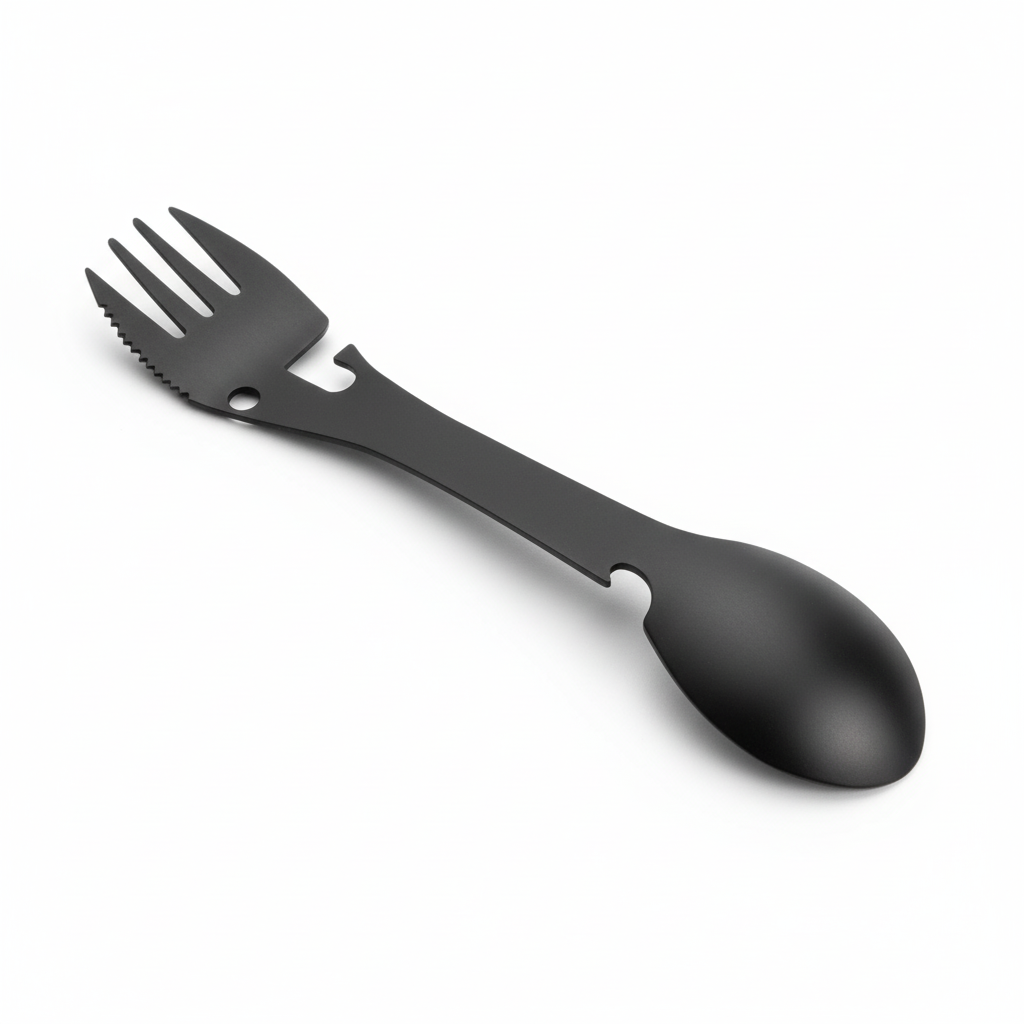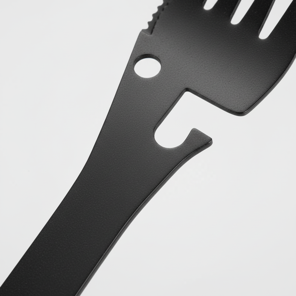 Combineert lepel, vork, mes, flesopener en blikkenopener in één. Geschikt voor kamperen, picknicken, wandelen en dagelijks gebruik.