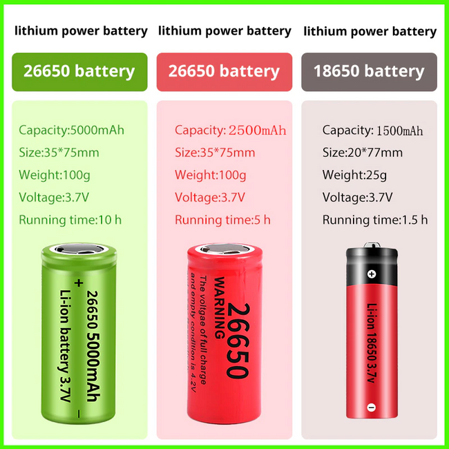 - Voeding: 1x26650 batterij of 1x18650 batterij (Oplaadbare)