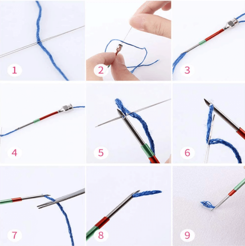 Om uw borduurpen klaar te maken, moet het garen eerst vanaf de achterkant in de pen worden gestoken, en vanaf de voorkant van de pen helemaal worden doorgetrokken, en vervolgens door het naaldgat worden gestoken.