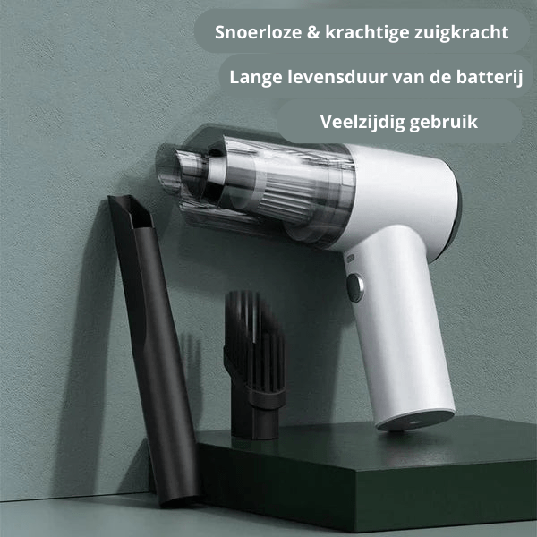 Onze snoerloze stofzuiger heeft een compact ontwerp, is licht (0,3kg) en draagbaar.  Onze stofzuiger is uitgerust met een krachtige koperen motor (120W motor) die zorgt voor een krachtige zuigkracht tot 6000 Pa. Met een ingebouwde LED-verlichting en een wasbaar dubbel hepa-filter kunt u stof, dierenharen, zand en etensresten met gemak verwijderen.