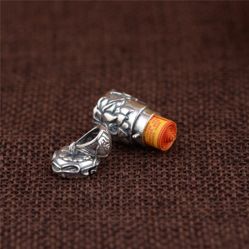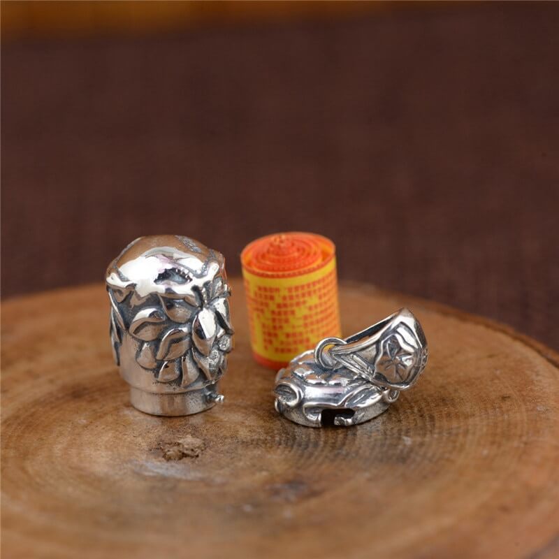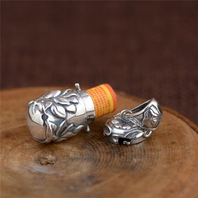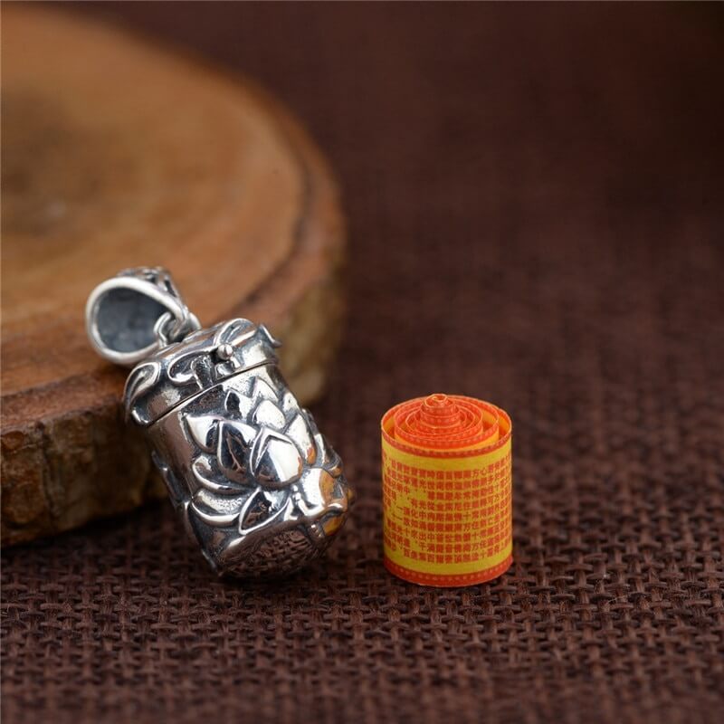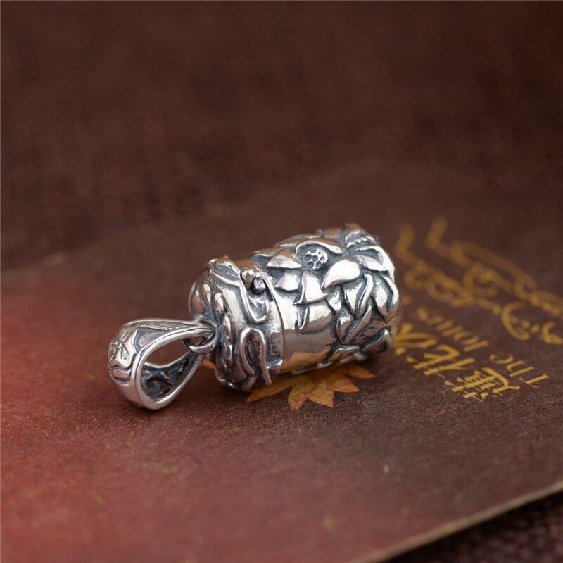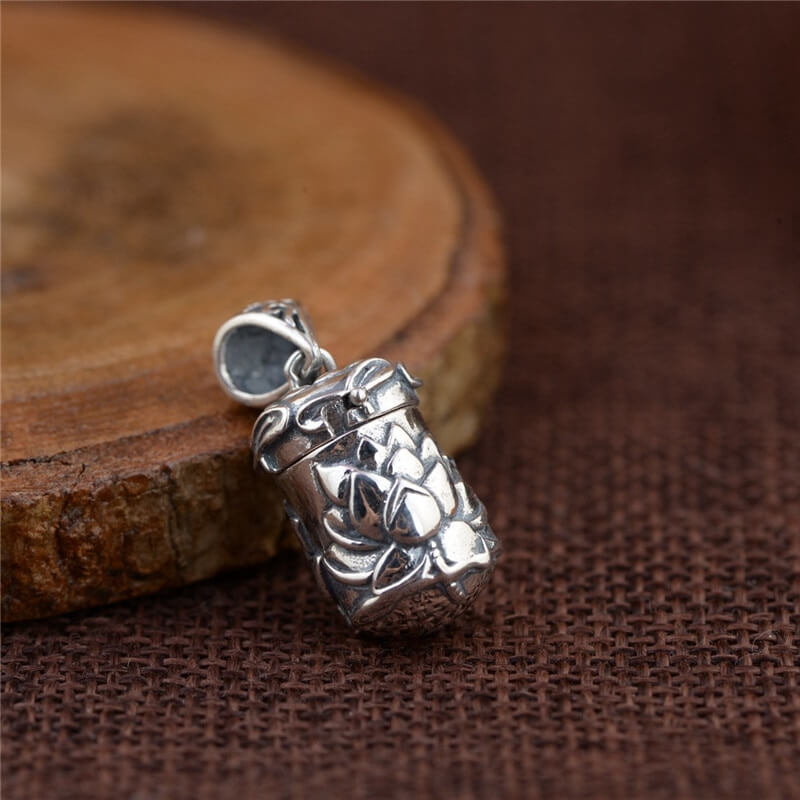 Deze Drijvende Lotus Mantra Hanger is ideaal voor een compassie mantra die erin geplaatst kan worden geschreven op een papieren rol voor eindeloos compassie. Het werkt perfect om het te vullen met allerlei dingen zoals noodpillen, de as van een geliefde, haar, geheime boodschappen, gebedsgedeelte, of andere privé items.